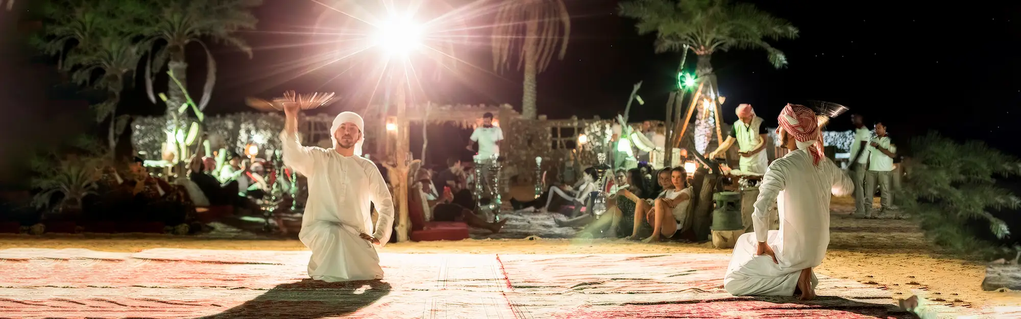 • Arrival at a torchlit desert oasis for a warm Arabic welcome with coffee and dates.